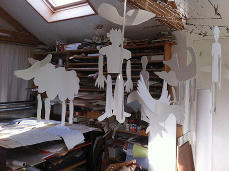 Twaalf witte figuren hangen in mijn atelier. Klaar voor de workshop bij